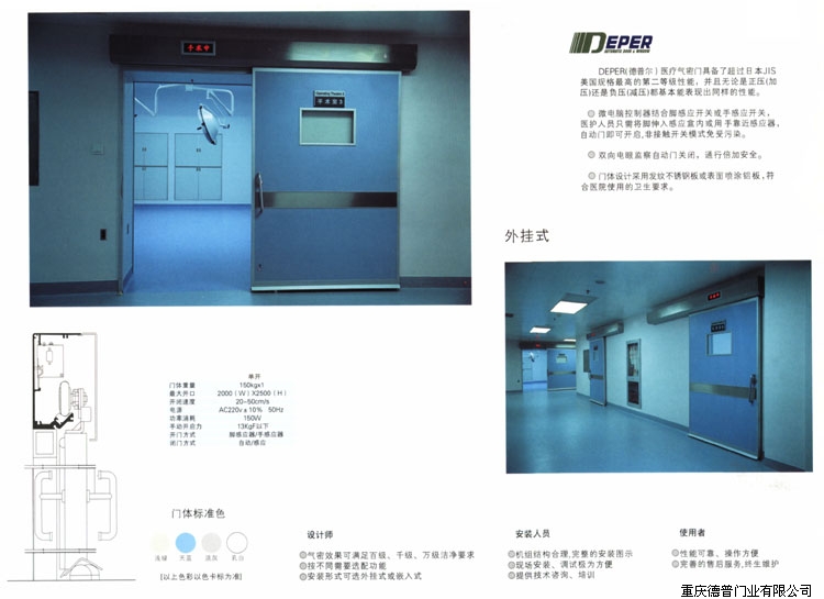 重慶德普自動(dòng)門公司專業(yè)從事:醫(yī)用鋼制門、自動(dòng)感應(yīng)門、醫(yī)用病房門、自動(dòng)旋轉(zhuǎn)門、手術(shù)室醫(yī)用自動(dòng)門、醫(yī)用潔凈潔門及門禁系統(tǒng)的設(shè)計(jì)安裝、維修售后服務(wù)為一體的門業(yè)公司。